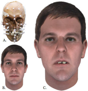When the evidence for a case includes the victim's skull (A), it may be possible to perform forensic facial reconstruction to further enhance the Snapshot prediction (B), resulting in the final blended Snapshot composite (C).